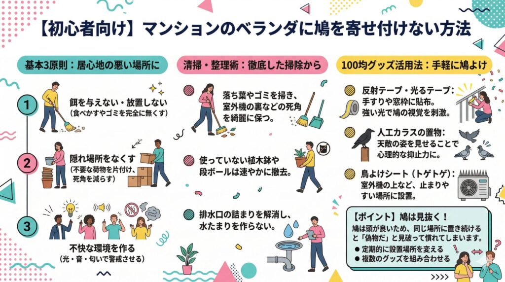 鳩を撃退するには、ベランダを「居心地の悪い場所」にすることが重要です。以下の3原則を徹底しましょう。