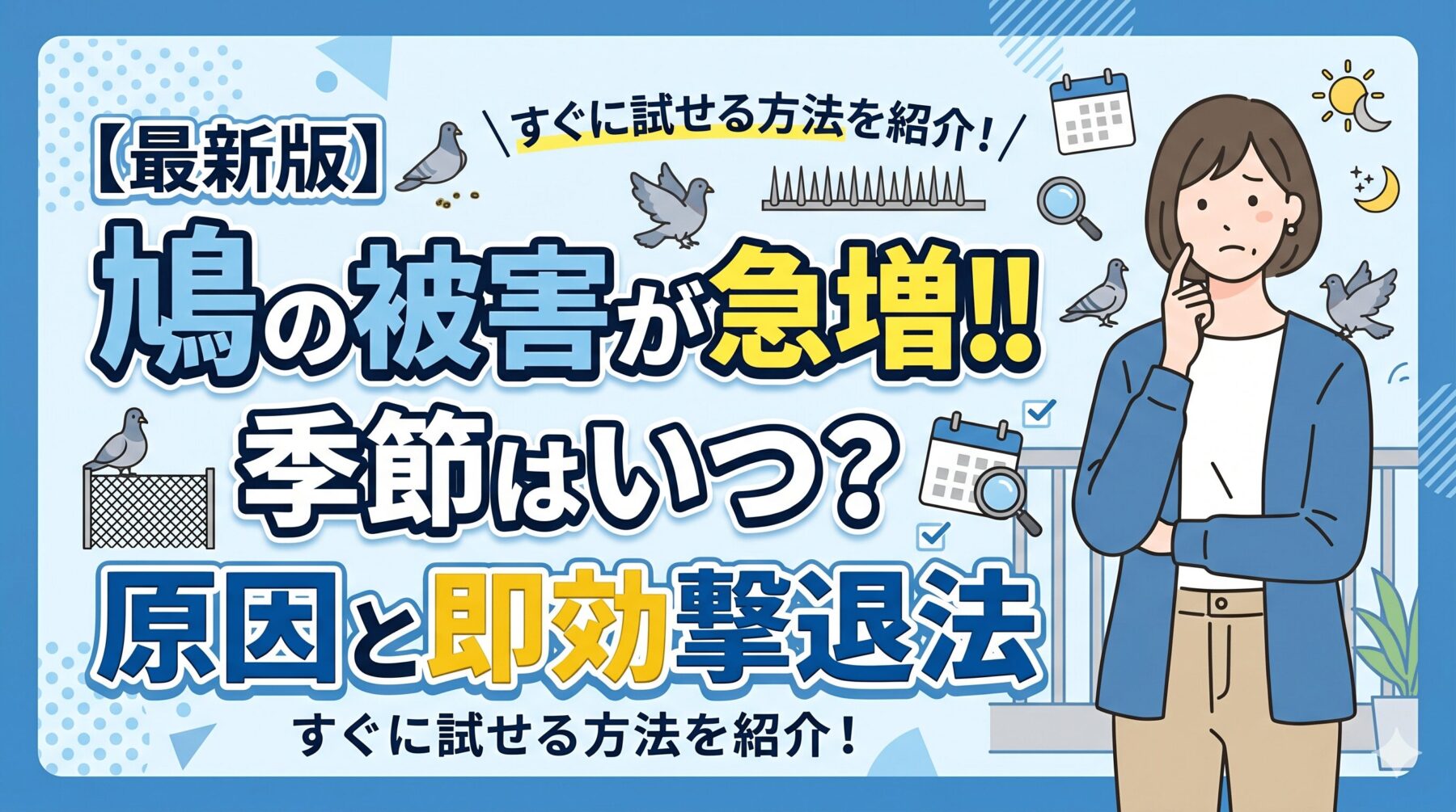 この記事では、鳩被害が増える時期のメカニズムや根本的な原因を科学的な視点から紐解き、即効性と持続性を兼ね備えた最新の対策法を徹底解説します。今日から実践できる正しいステップを学び、鳩被害ゼロの快適な暮らしを取り戻しましょう!