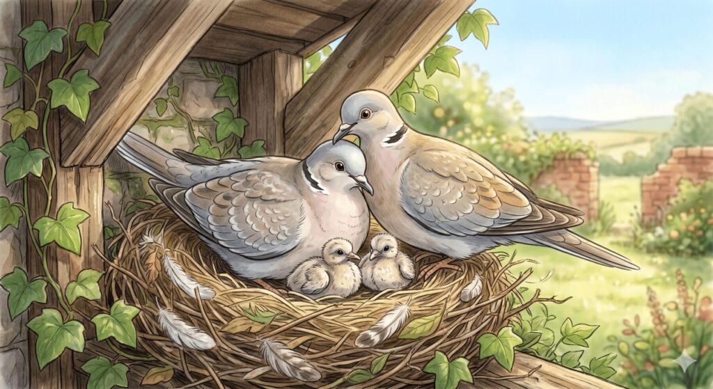 鳩は通常、一度に2個の卵を産みます。雌雄が交代で卵を温め(抱卵)、「約16〜18日」という短期間で孵化します。