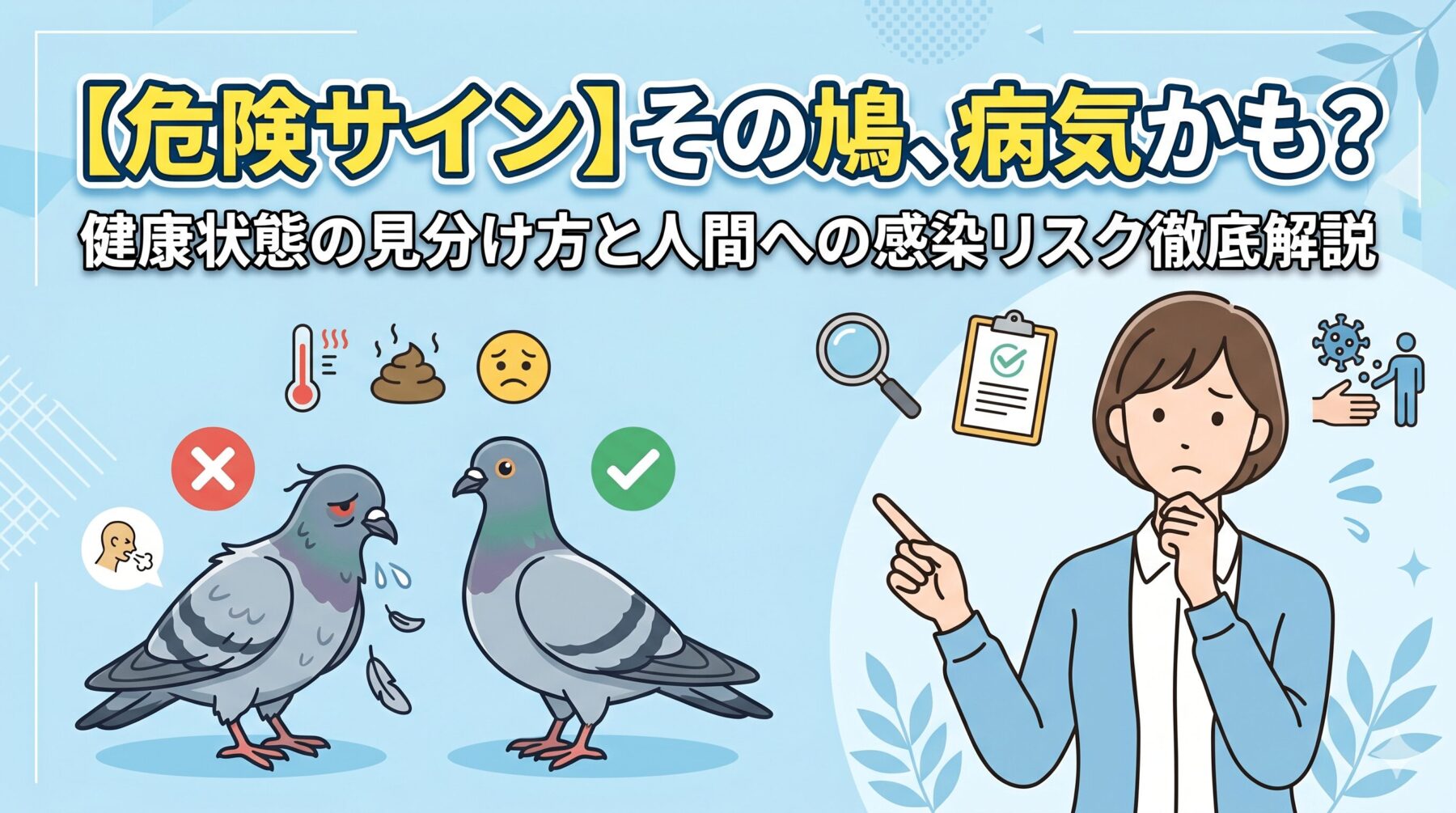「たかが鳩」と甘く見てはいけません。彼らが発する危険サインを見逃さず、少しでも異常を感じたら近づかないことが最大の防衛策です。 もしベランダなどにフンをされた場合は、正しい知識で徹底した予防対策(湿らせてからの掃除・マスク着用)を行ってください。鳩との接触後や掃除後に長引く咳や高熱が出た場合は、迷わず医療機関を受診しましょう!